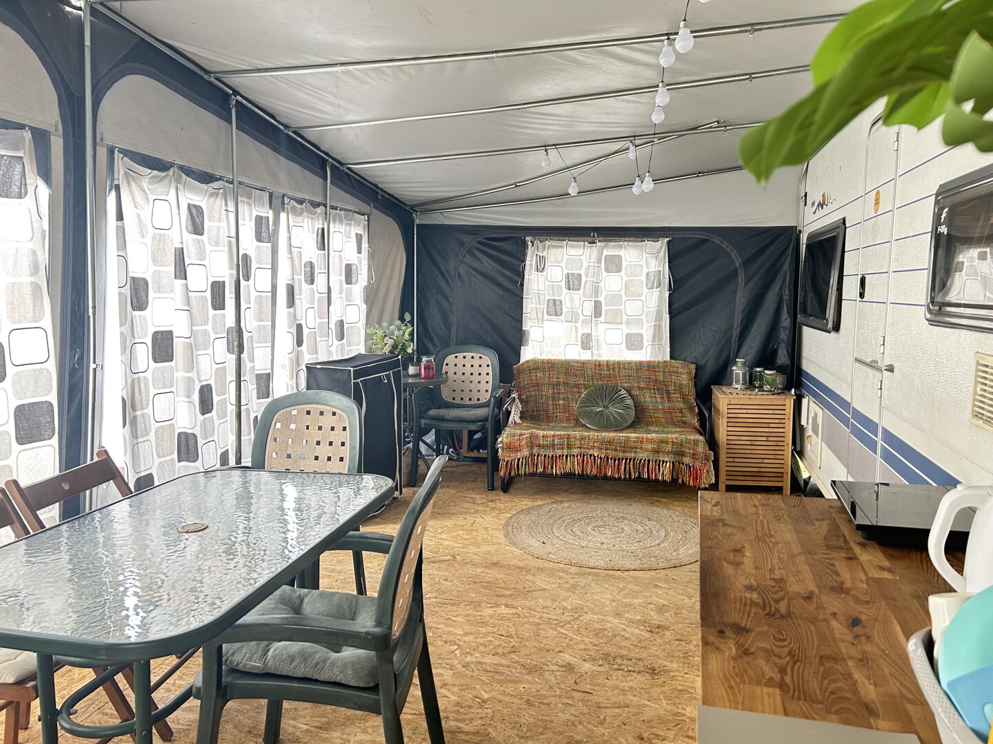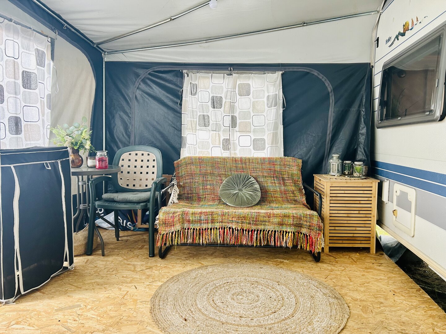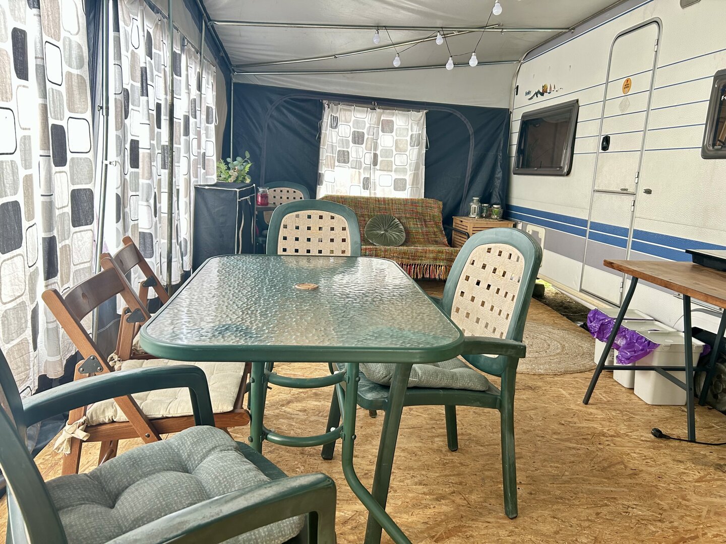 Duża przestronna przyczepa w klimacie nadmorskim 6 osobowa z przestronnym przedsionkiem. Łazienka i toalety zewnętrzne.