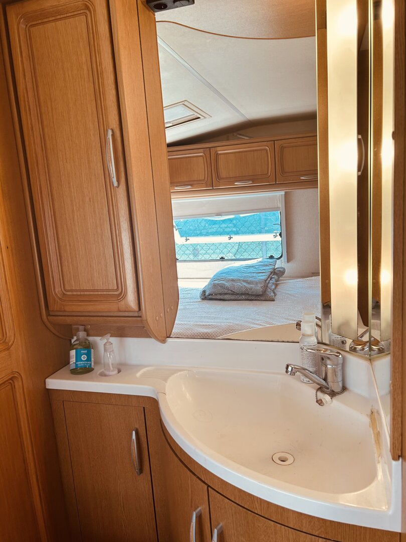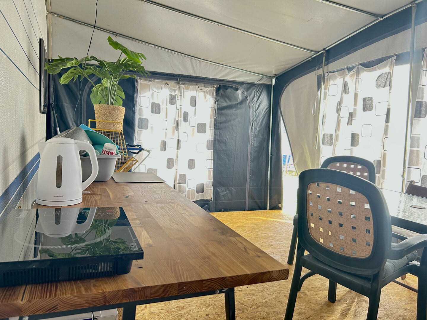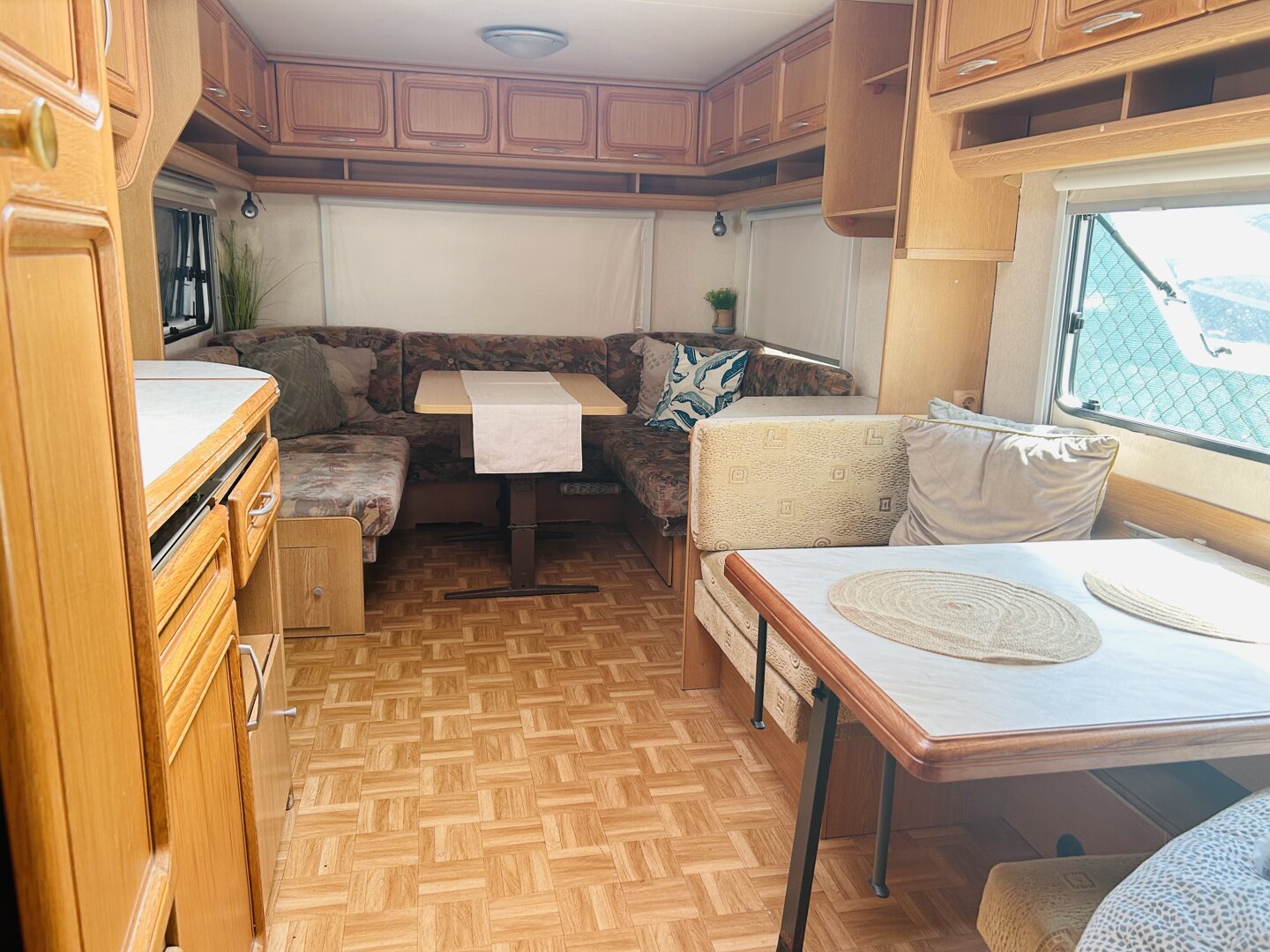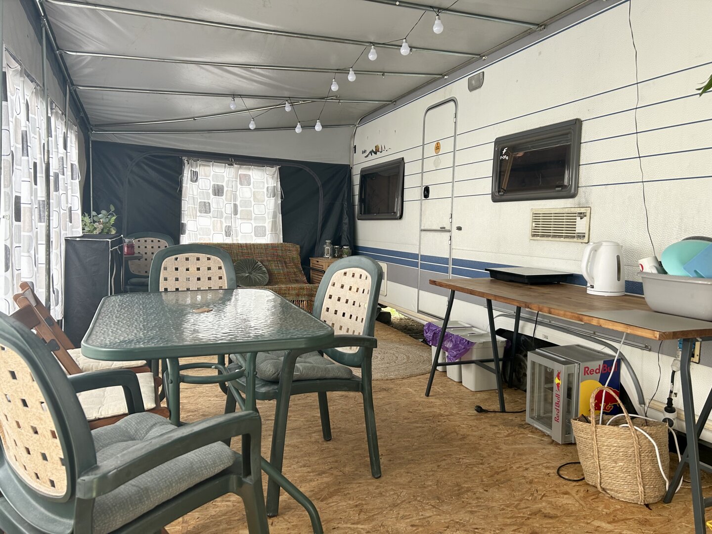 Duża przestronna przyczepa w klimacie nadmorskim 6 osobowa z przestronnym przedsionkiem. Łazienka i toalety zewnętrzne.